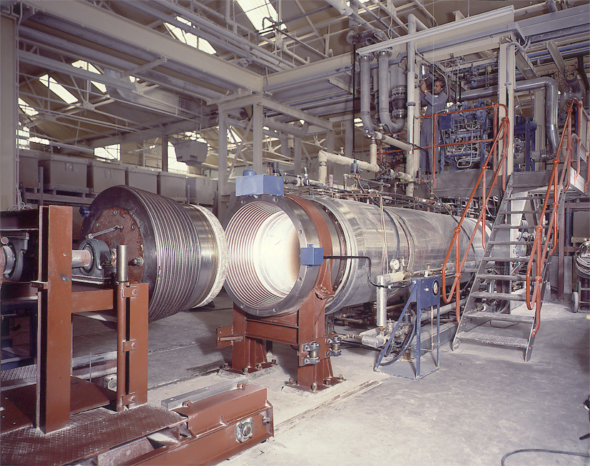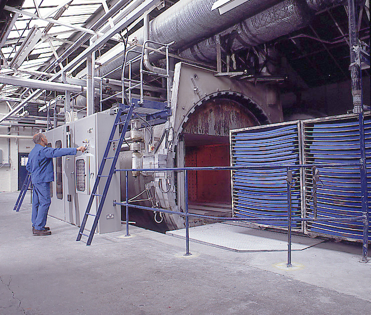 The plastic slabs are loaded into a carriage system that feeds into high-pressure autoclaves where they are heated above softening temperature in an atmosphere of pure nitrogen. Final cooling retains the nitrogen in the plastic.
